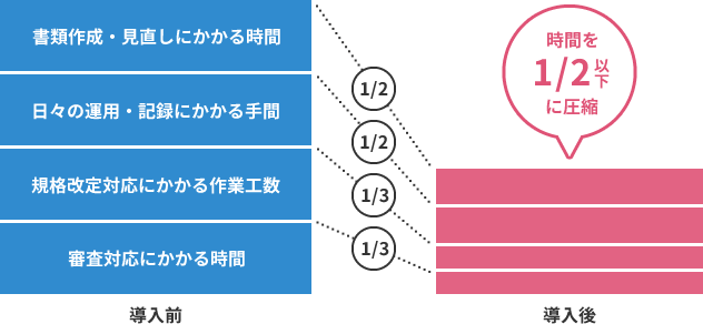 Pマークアシストの導入で、はじめてのPマーク取得時はもちろん、取得後の定期的な運用もスムーズ化されます。文書などの見直し・管理にかかる時間や、維持審査や更新審査にかかる負担を半分に圧縮することも可能。その分、本来の重要な業務を優先できるようになります。